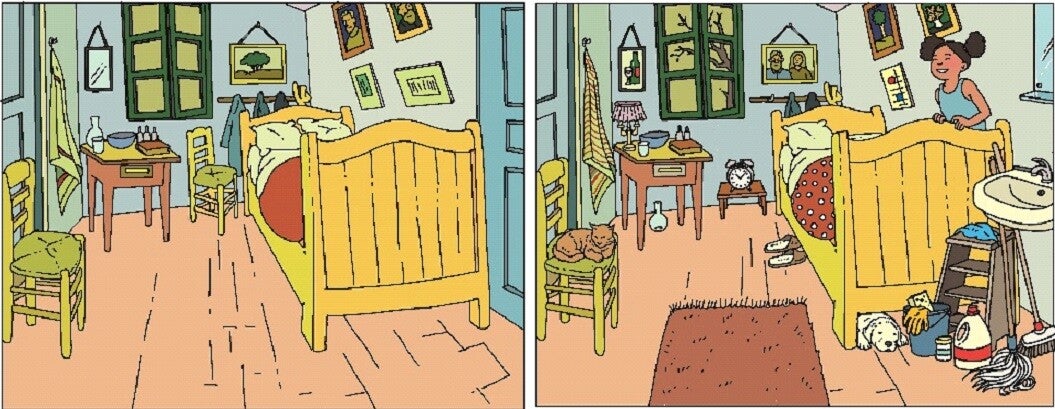 In het doosje vind je 24 kaarten. 12 wereldberoemde schilderijen van Europese schilders zijn opnieuw getekend. En daarna nog een keer; maar dan met in ieder schilderij 30 verschillen. Alle verschillen zijn relevante woorden. Op de stoel in het kamertje van van Gogh ligt een poes en in het schilderij van Breugel staat het raam open. Alle in totaal 360 verschillen staan uitgeschreven in het bijbehorende lesboek. Hier vind je ook woordenlijsten en leuke informatie over de kunstenaars en de schilderijen. Dit spel kan je prima spelen met zowel beginners als gevorderden. Jong en oud, van analfabeet tot hoog opgeleide cursist; iedereen vindt dit fantastisch om te doen en om steeds te herhalen. Cursisten hebben tijdens het spelen niet meer in de gaten dat ze aan het leren zijn, zo leuk is het!